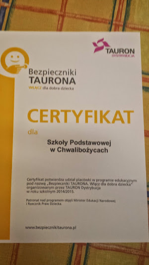 Uczniowie uczestniczyli w warsztatach edukacyjnych Bezpieczniki Taurona. Otzrymaliśmy certyfikat objęty patronatem Ministra Edukacji Narodowej i Rzecznika Praw Dziecka, pn."Bezpieczniki Taurona. Włącz dla dobra dziecka".