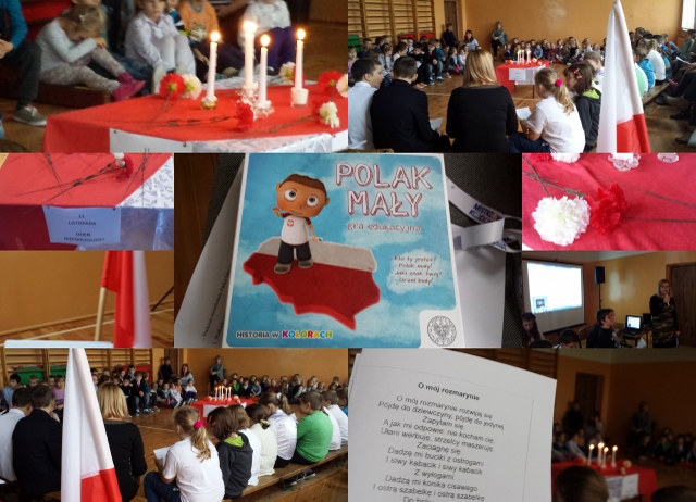 Klasa 6 wraz z wychowawczynią zaprosili społeczność szkolną na świeczowisko, z okazji zbliżającego się Święta Niepodległości. Przy blasku świec uczniowie śpiewali pieśni patriotyczne oraz poznawali karty z historii Polski. Była to wyjątkowa lekcja Historii. Na koniec pani Bożena zainicjowała recytację wiersza ,,Kto Ty jestes?"- wszyscy się do niej włączyli, aż miło było posłuchać. Świeczowisko zakończyliśmy odśpiewaniem hymu Polski.