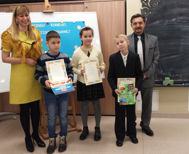 I miejsce zdobyli: Jakub Dobrowolski ze szkoły w Chwalibożycach i Zofia Zając ze szkoły w Marcinkowicach. Na II miejscu z różnicą jednego punktu uplasował się Rafał Szymański z naszej szkoły a na miejscu III Oliwia Durlej ze szkoły w Bystrzycy. O piękne nagrody zadbali sponsorzy Szkoła podstawowa w Chwalibożycach, wydawnictwo Mac Edukacja-reprezentowane przez p.Agnieszkę Misiewicz oraz Wydział Promocji Gminy Oława. Dyplomy i nagrody wręczał dyrektor GZO w Oławie Stanisław Górka.