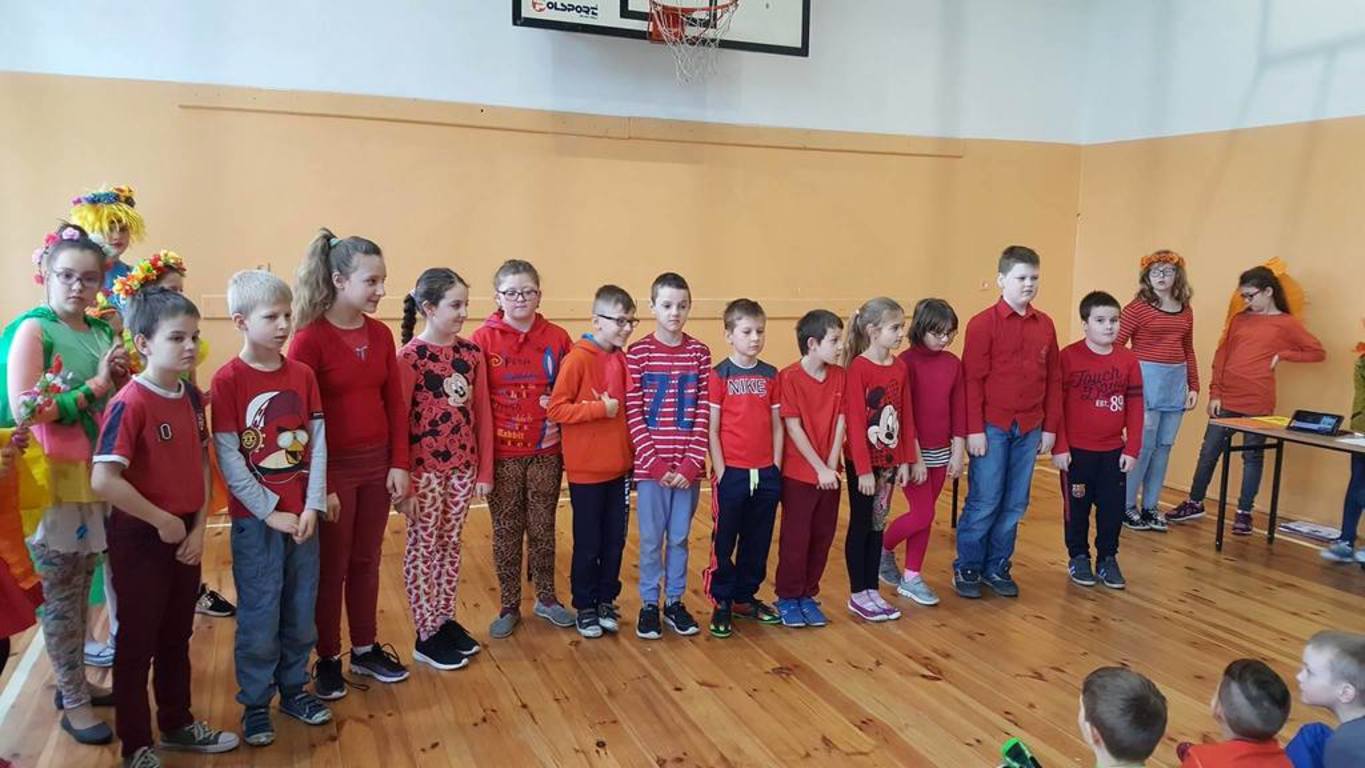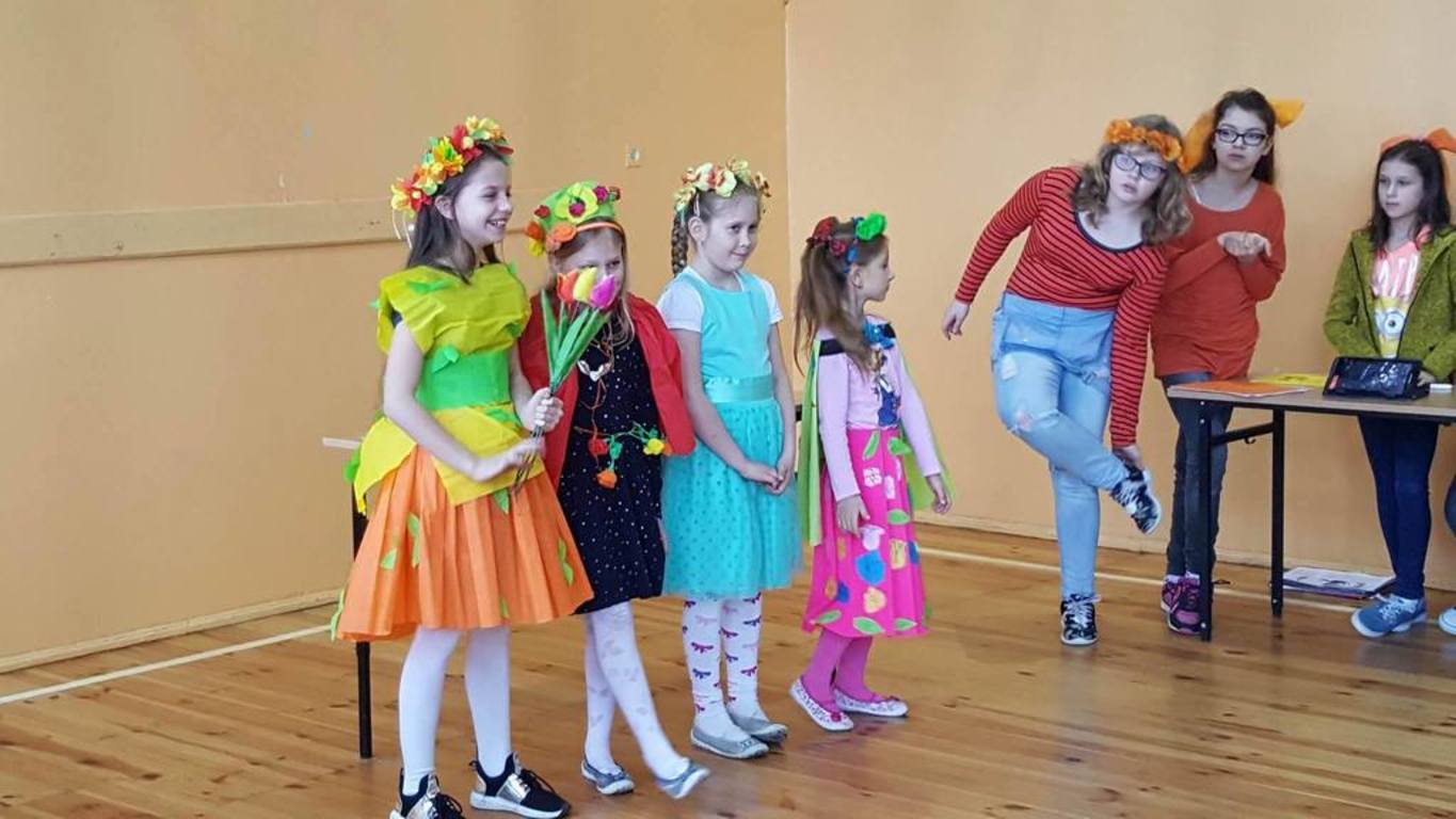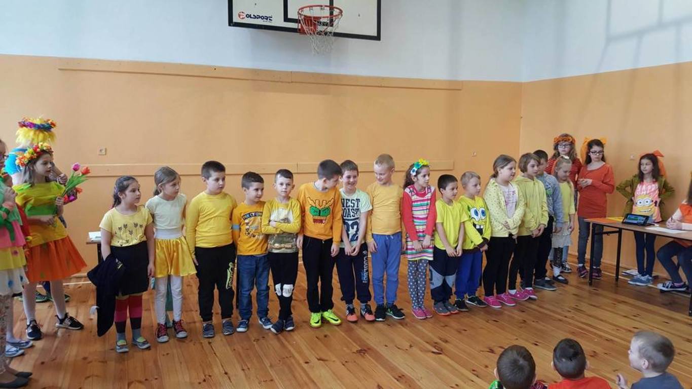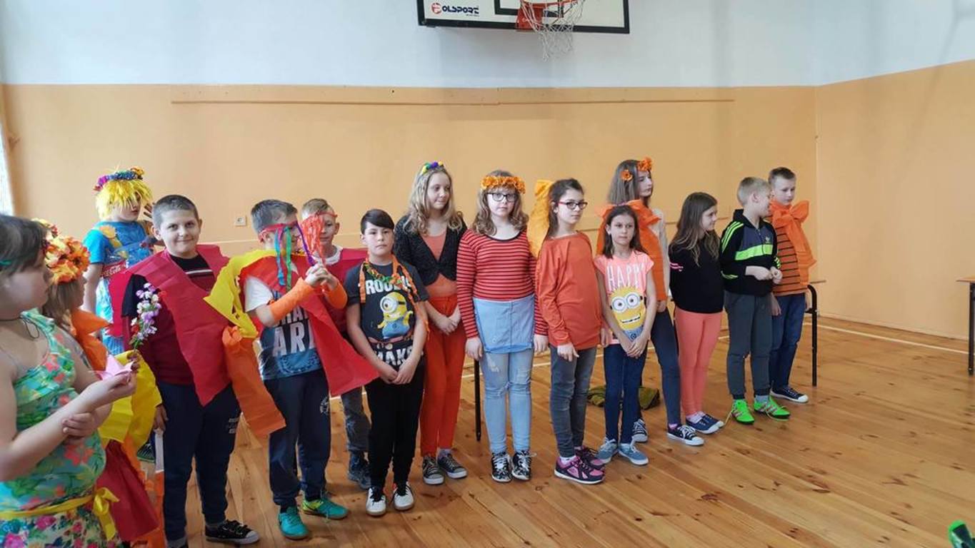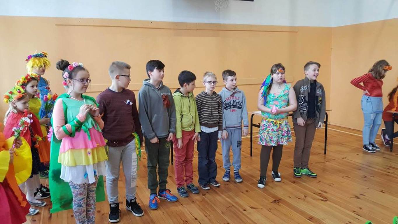 Dnia 21 marca 2017 r w naszej szkole powitaliśmy pierwszy dzień wiosny. Każda klasa przygotowała wiosenną gazetkę w klasie oraz panią wiosnę. Na trzeciej godzinie lekcyjnej spotkaliśmy się na sali gimnastycznej. Uczennice klasy V przedstawiły informacje o wiośnie i wiersz, a potem przedstawiciele każdej klasyrozwiązywali zadania. Na sali było kolorowo, bo każda klasa ubrała się na inny kolor. Klasa 0 miała ułożyć kwiatka i podać jego nazwę, klasy I-III odgadywały zagadki, a klasy starsze szukały w tekście nazwy roślin i zwierząt. Oceniona została również pani wiosna przygotowana przez klasy. Jury w składzie p.A.Kotwica i p.A.Grabarz przyznały miejsca aż 3 pierwsze miejsca dla klas 0, I, i VI, miejsce II dla klas IV, V i I i trzecie dla klasy II. TS
