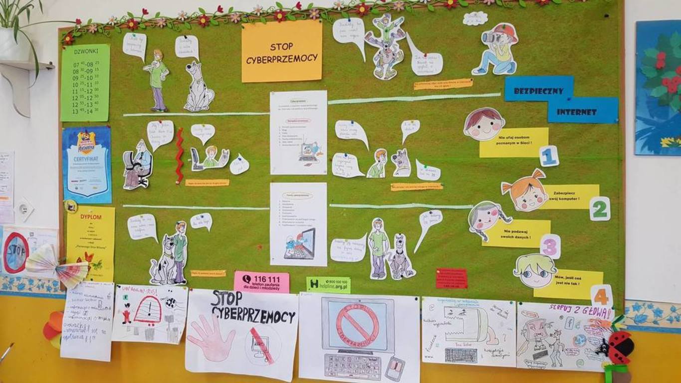 Najbardziej pomysłowa tablica informacyjna jest w klasie I. To komiks ze Scooby-Doo, który mówi o zasadach zachowania w sieci. Dodatkowo uczniowie wykonywali rysunki pod hasłem Stop cyberprzemocy. Im. Brawo!