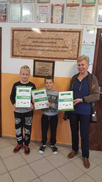 Pani od matematyki przedstawiła laureatów ogólnopolskiego konkursu Mały Matematyk z klasy III. Gratulujemy Amelka Kotwica, Bartek Bugiera i Alan Maszkowski