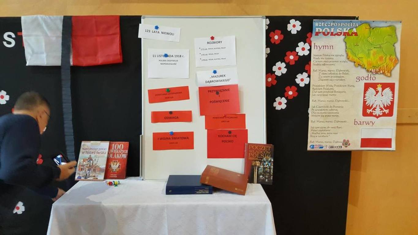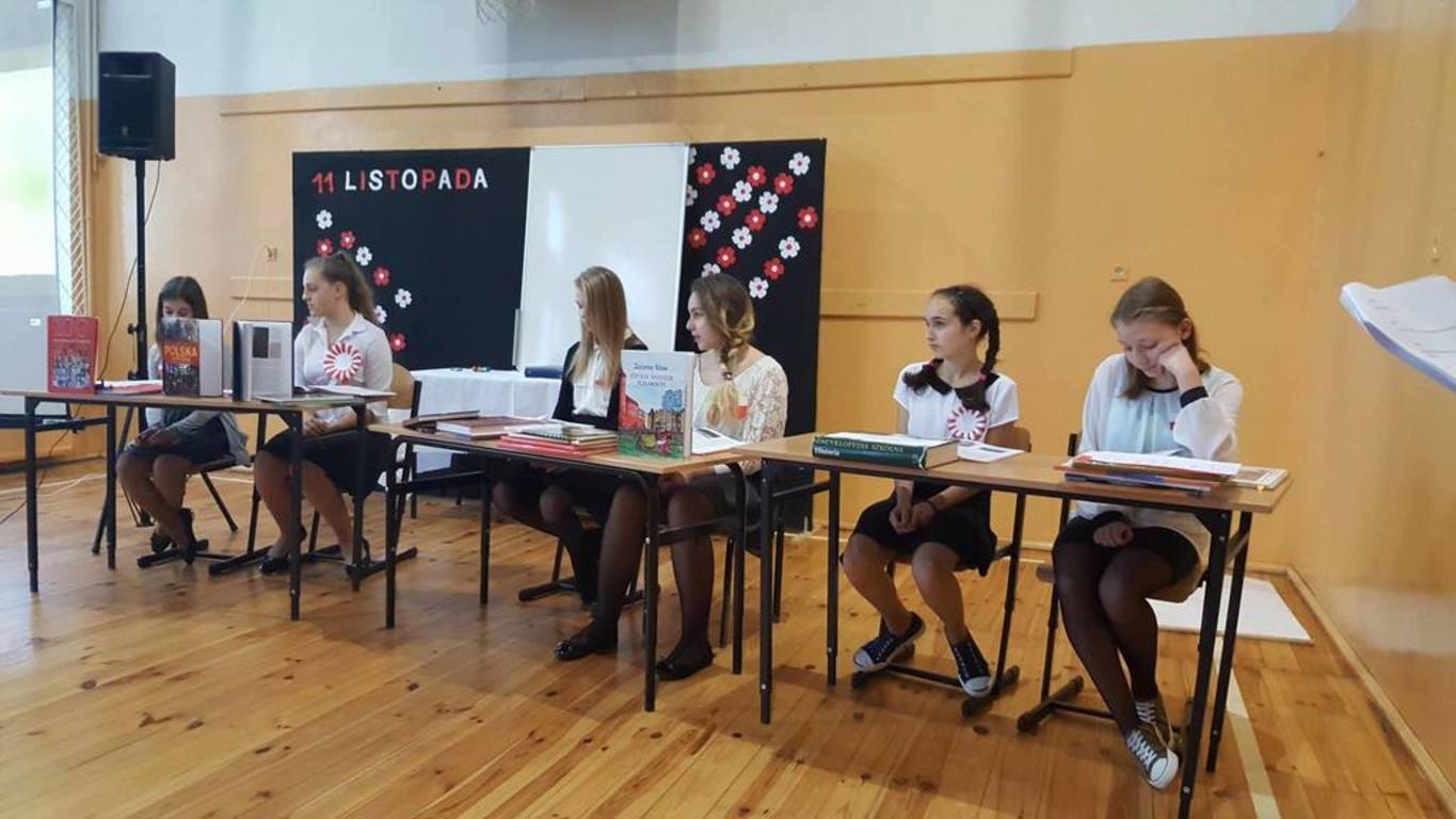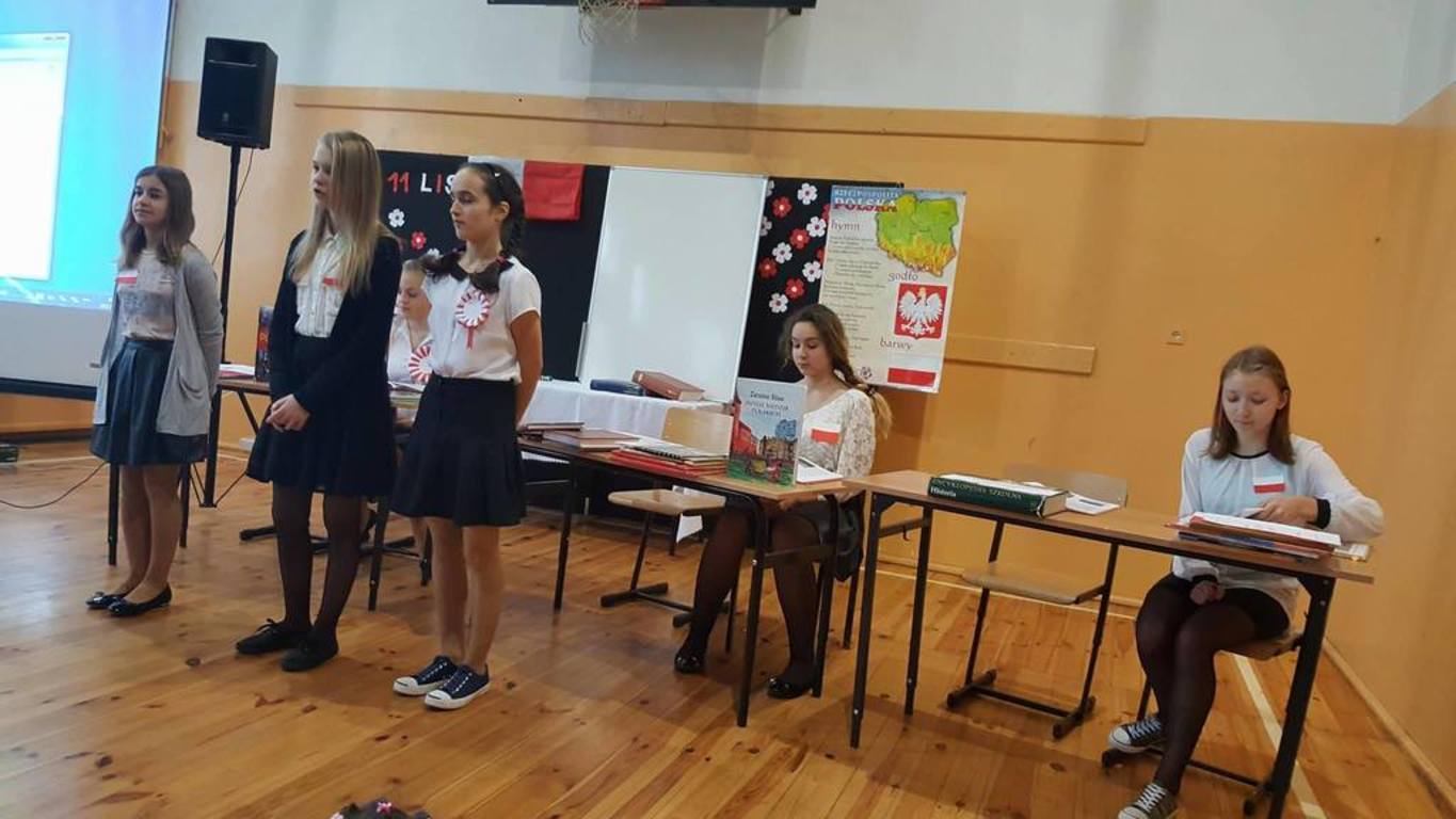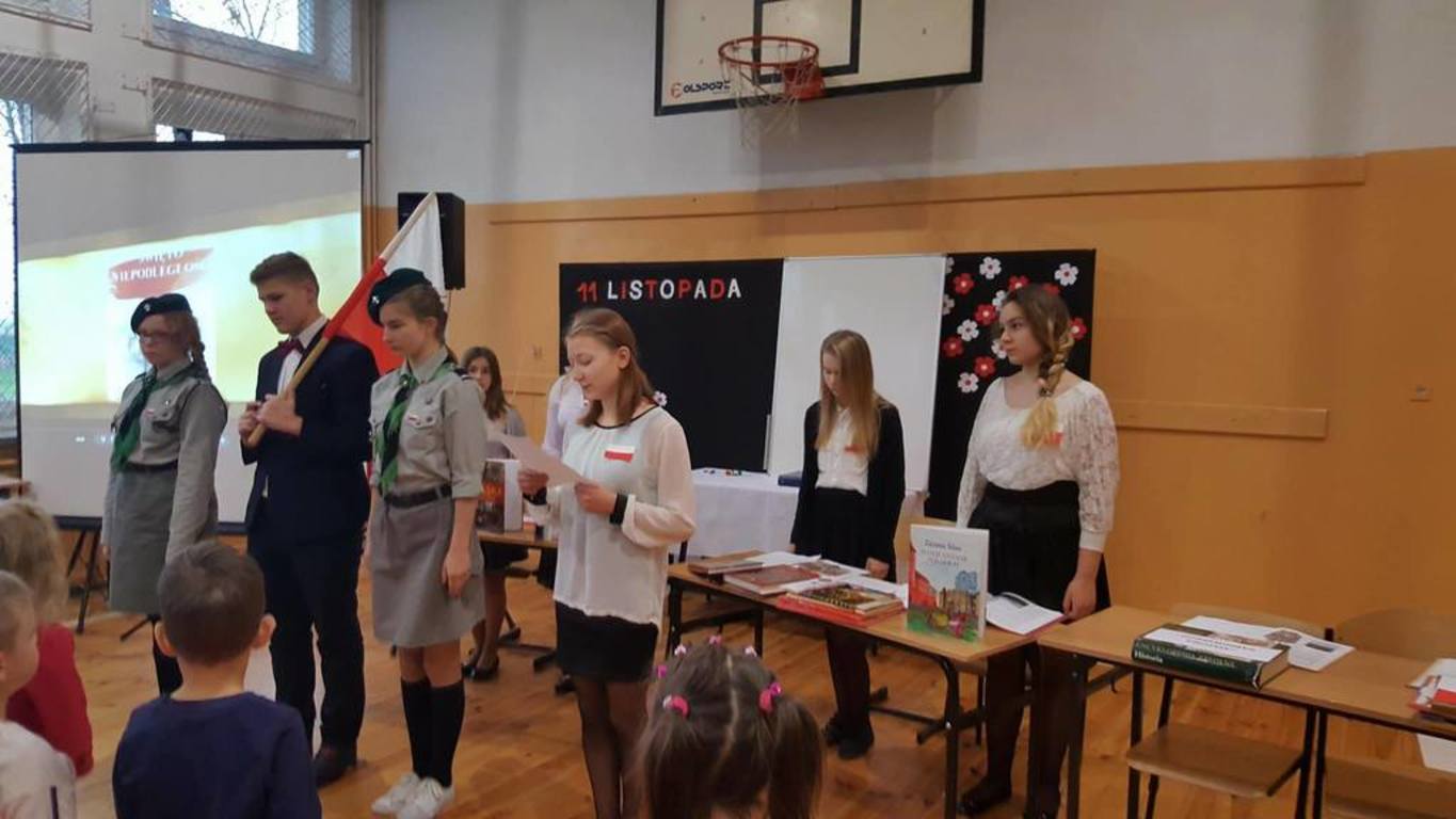 Odświetnie ubrani uczniowie uczcili 99 rocznicę odzyskania niepodległości przez Polskę, po 123 latach niewoli. Przygotowany montaż informacyjno-muzyczny doskonale wyjaśnił uczestnikom losy naszej ojczyzny. Wszyscy zebrani śpiewali patriotyczne piosenki, które w czasie niewoli czy wojny zagrzewały naszych rodaków do walki. Teraz mamy juz wolną Polskę, cieszmy się, że jesteśmy Polakami. Kocham Cię, Polsko- z tą pieśnią na ustach, uczniowie rozeszli sie do klas.