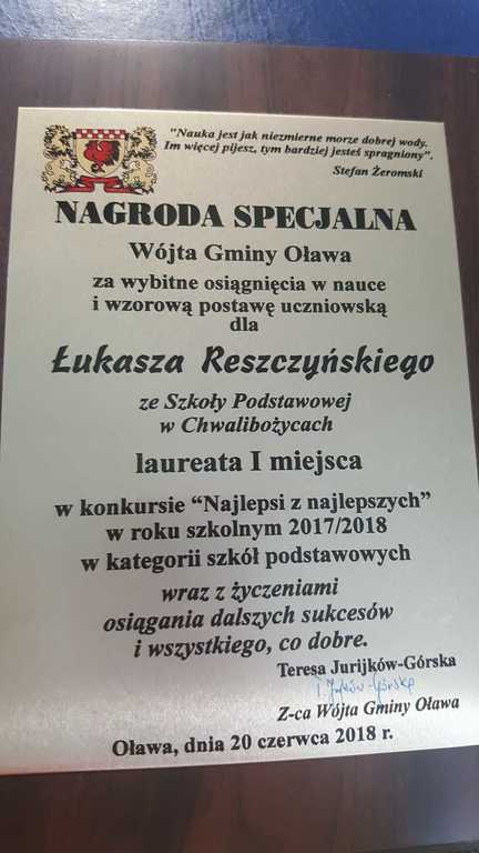 Po raz pierwszy tytuł Najlepszy z Najlepszy trafił do naszej szkoły. To Łukasz Reszczyński z klasy 6 wyróżnił sie najlepszymi wynikami w nauce i dodatkowymi umiejętnościami a także pracą społeczną, ze wszystkich najlepszych uczniów w Gminie Oława. Często pisalismy na naszej stronie o jego sukcesach i bardzo nas ten tytuł cieszy. W imieniu władz gminy, nagrody wręczali Stanisław Górka, dyr GZO w Oławie oraz Mariusz Michałowski- przewodniczący Komisji Oświaty.