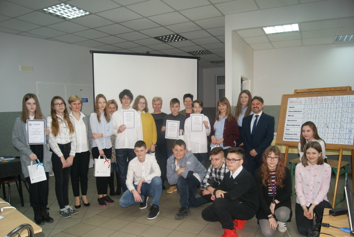 28 lutego w Marcinkowicach odbył się Gminny Konkurs Matematyczny-Matematyka jak w banku, na którym nasi uczniowie zajęli drużynowo III miejsce- Gratulacje dla Łukasza i Kingi z kl.VII oraz p. T.Stolf