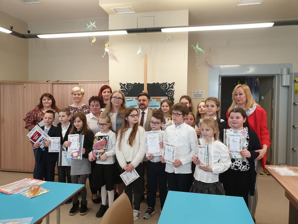 27 marca 2019 r. w Bibliotece dziecięcej Koronka w Oławie odbył się XVII Gminny Konkurs "Pociągiem do wiedzy" dla uczniów klas III szkół podstawowych Gminy Oława. Nasza szkoła była organizatorem tego konkursu. Przyjazna atmosfera i niepowtarzalny klimat biblioteki sprzyjały uczestnikom w rozwiązywaniu zadań polonistycznych, przyrodniczych i matematycznych. Uczeń klasy III, Szymon Sucharski, wykazał się szeroką wiedzą i odpornością na stres zwiazany z udziałem w konkursie, dzięki czemu zdobył III miejsce. Gratulujemy!!!