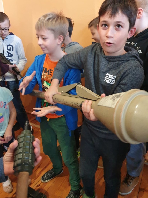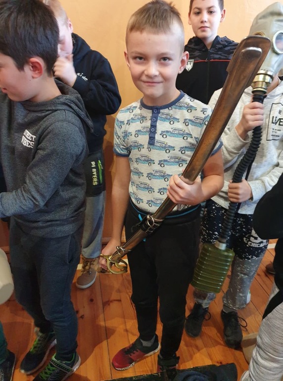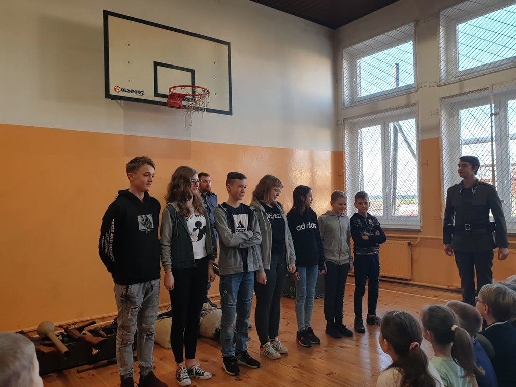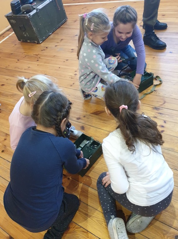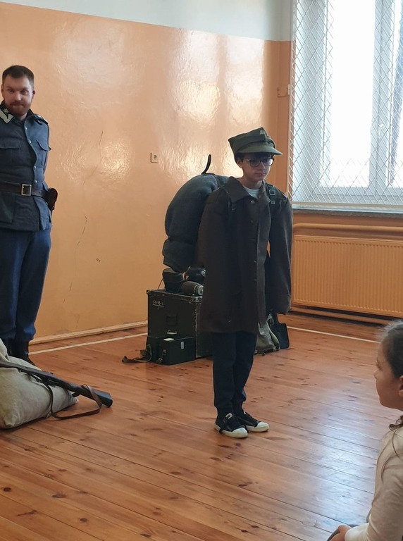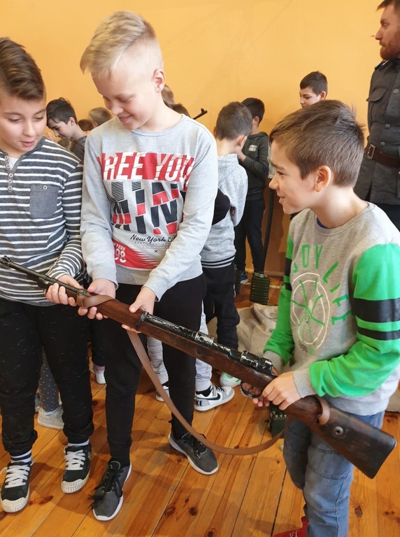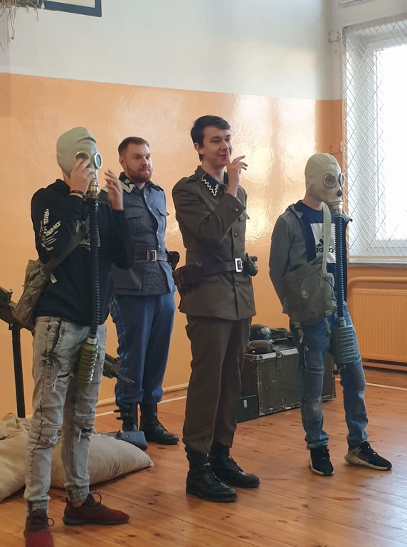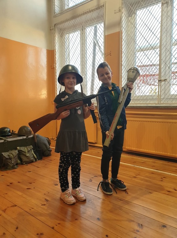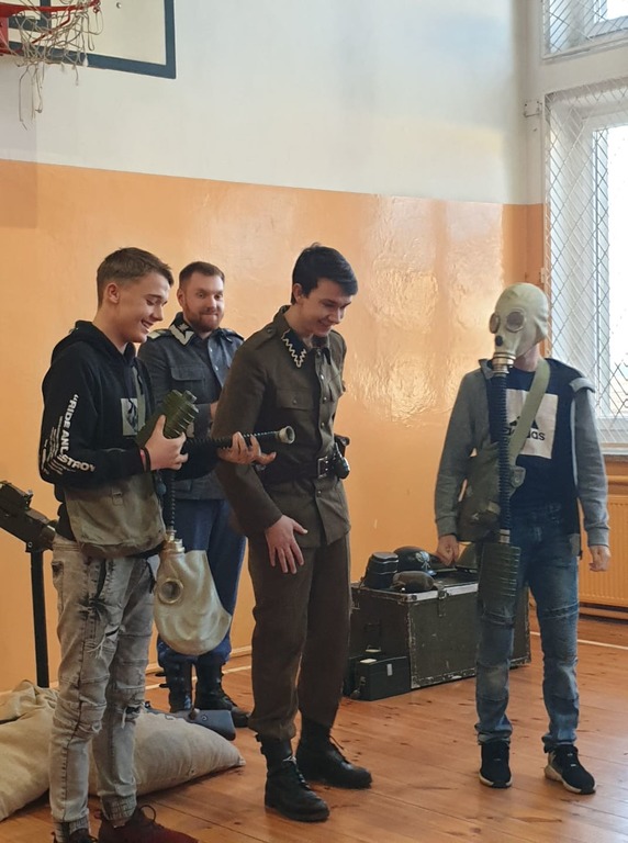 28 listopda gościliśmy grupę rekonstrukcyjną, która przybliżyła uczniom losy żołnierza polskiego w czasie II wojny światowej. 1 wrzesnia 2019 roku wypadła 80. rocznica jej wybuchu. Uczniowie mogli się wykazać swoją wiedzą historyczną z tego okresu i całkiem dobrze im poszło- były plusy i piatki. Z bliska można było zobaczyć broń, przymierzyć hełm i sprawdzić ciężar żołnierskiego plecaka. Baczność, spocznij!, te komendy znają wszyscy ale starsi uczniowie mogli przećwiczyć je na własnym przykładzie, a także założyć maskę przeciwgazową na czas. W wojksu ważną rolę odgrywają też telegrafiści- w tę rolę wcieliły się dziewczynki z kl.1 i 0.