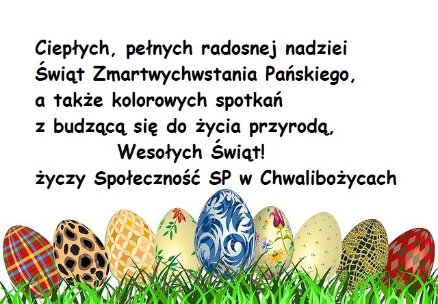 Ciepłych, pełnych radosnej nadziei Świąt Zmartwychwstania Pańskiego, a także kolorowych spotkań z budzącą się do życia przyrodą, Wesołych Świąt życzy Społeczność SP w Chwalibożycach