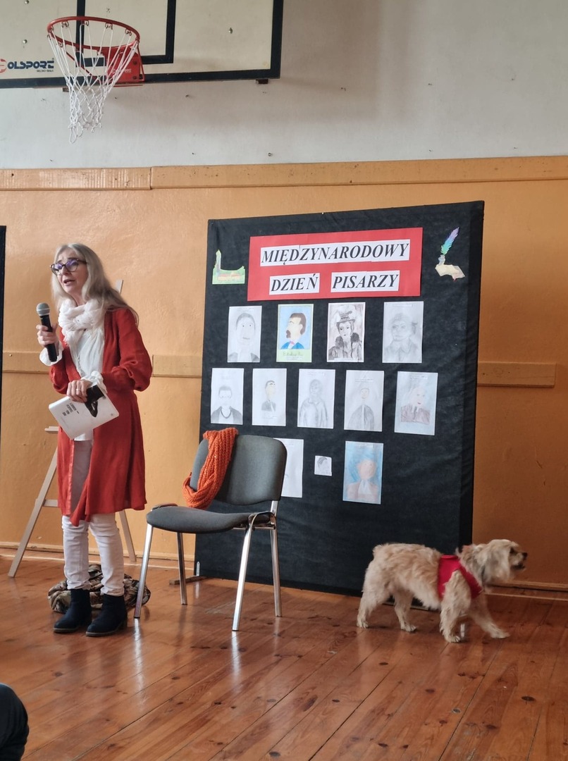 W dniu 17 marca 2022 r. w naszej szkole odbyła się uroczystość upamiętniająca Międzynarodowy Dzień Pisarzy, którego celem jest promowanie literatury oraz obrona wolności i rozwój społeczności pisarzy na całym świecie. Z tej okazji nasze zaproszenie przyjęła Pani Violetta Nowakowska- wrocławska pisarka i dziennikarka, autorka kilkunastu książek dla dzieci i dorosłych, w których poruszane są problemy społeczne, ekologia i zwierzęta oraz życie rodzinne. Dodatkową atrakcją było to, że Pani Violetta przybyła ze swoim pieskiem, który oczarował wszystkich, a szczególnie młodszą widownię.