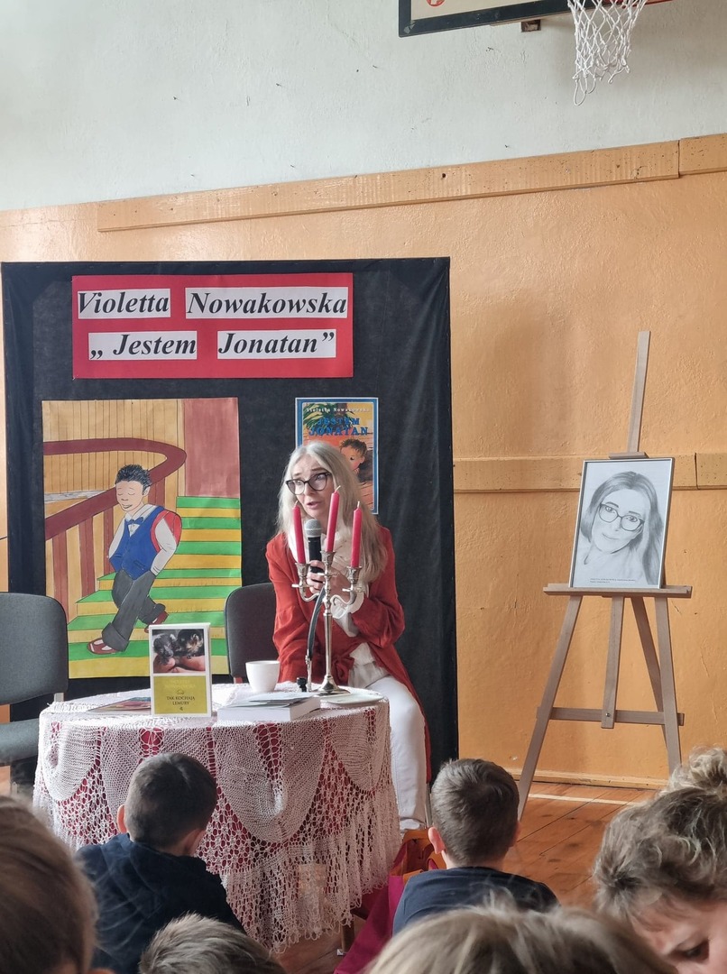 Po powitaniu honorowego Gościa przez Panią Dyrektor- Monikę Piasecką- Galej, konferansjerzy (Kaja Druszcz i Bartek Bugiera z kl.7) rozpoczęli spotkanie i zaprosili przedstawicieli z klasy 8- Klaudię Mołdawiak i Krzesimira Terleckiego - o przeczytanie rozdziału z książki pt. "Jestem Jonatan" autorstwa Pani Violetty Nowakowskiej. W dalszej kolejności głos już należał do Gościa, który wprowadził nas w świat książek. Pisarka także chętnie odpowiadała na pytania przygotowane przez uczniów naszej szkoły.