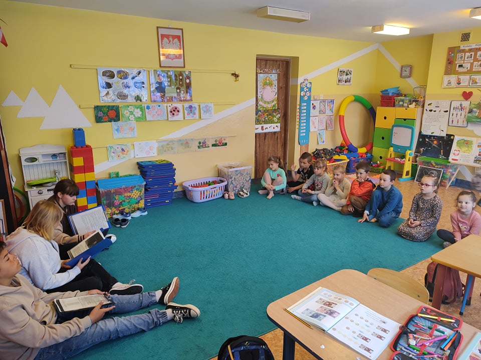 Dzieci mogły zapoznać się z regulaminem biblioteki i pierwszy raz wypożyczyć książeczki. W tym dniu również uczniowie z klasy 6. - Oliwia Wodnicka, Lena Woźniak i Fabian Węglarz czytali przedszkolakom oraz młodszym klasom kolejny rozdział przygód ,,Myszaka spod Mądrego Drzewa".