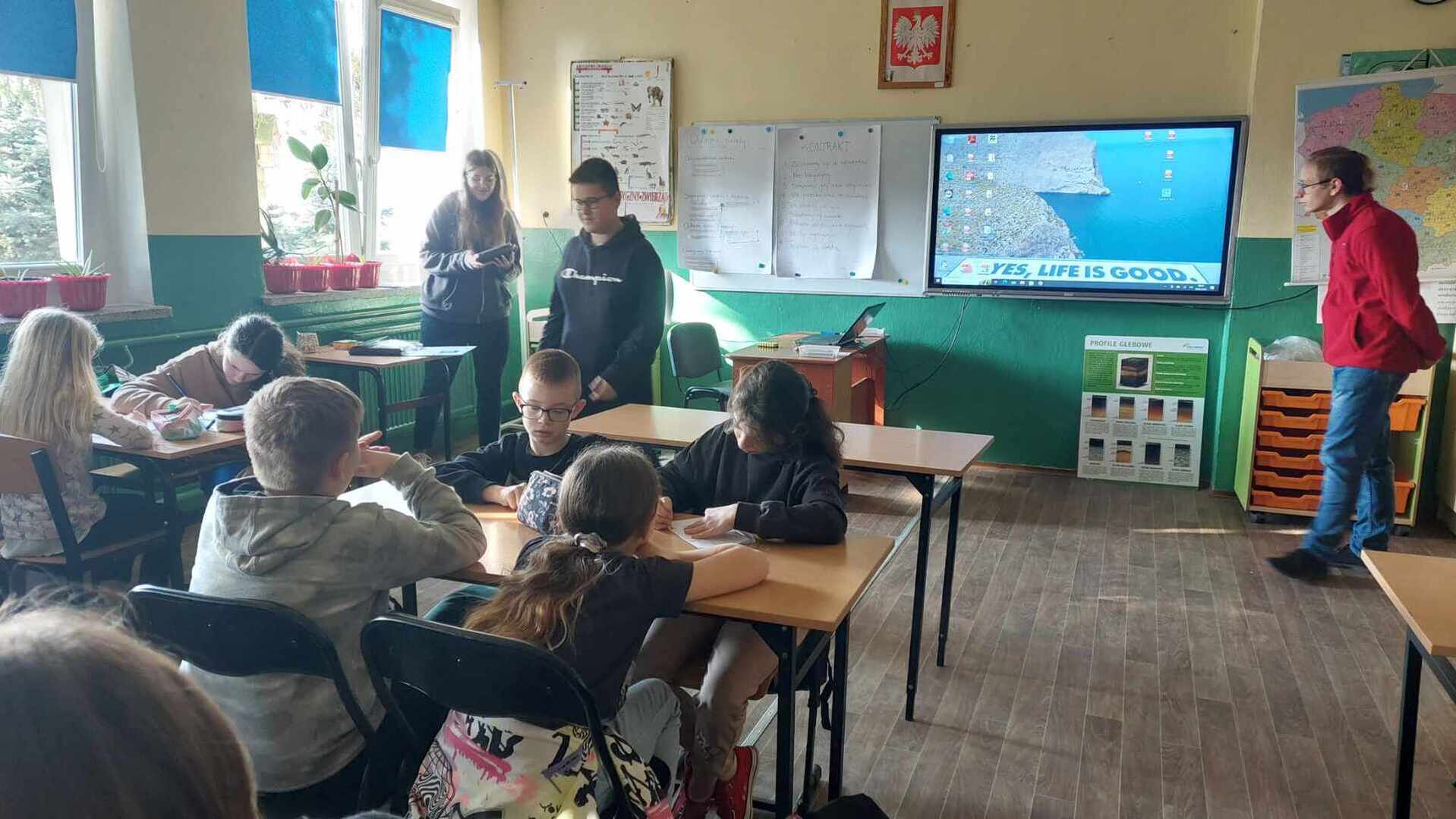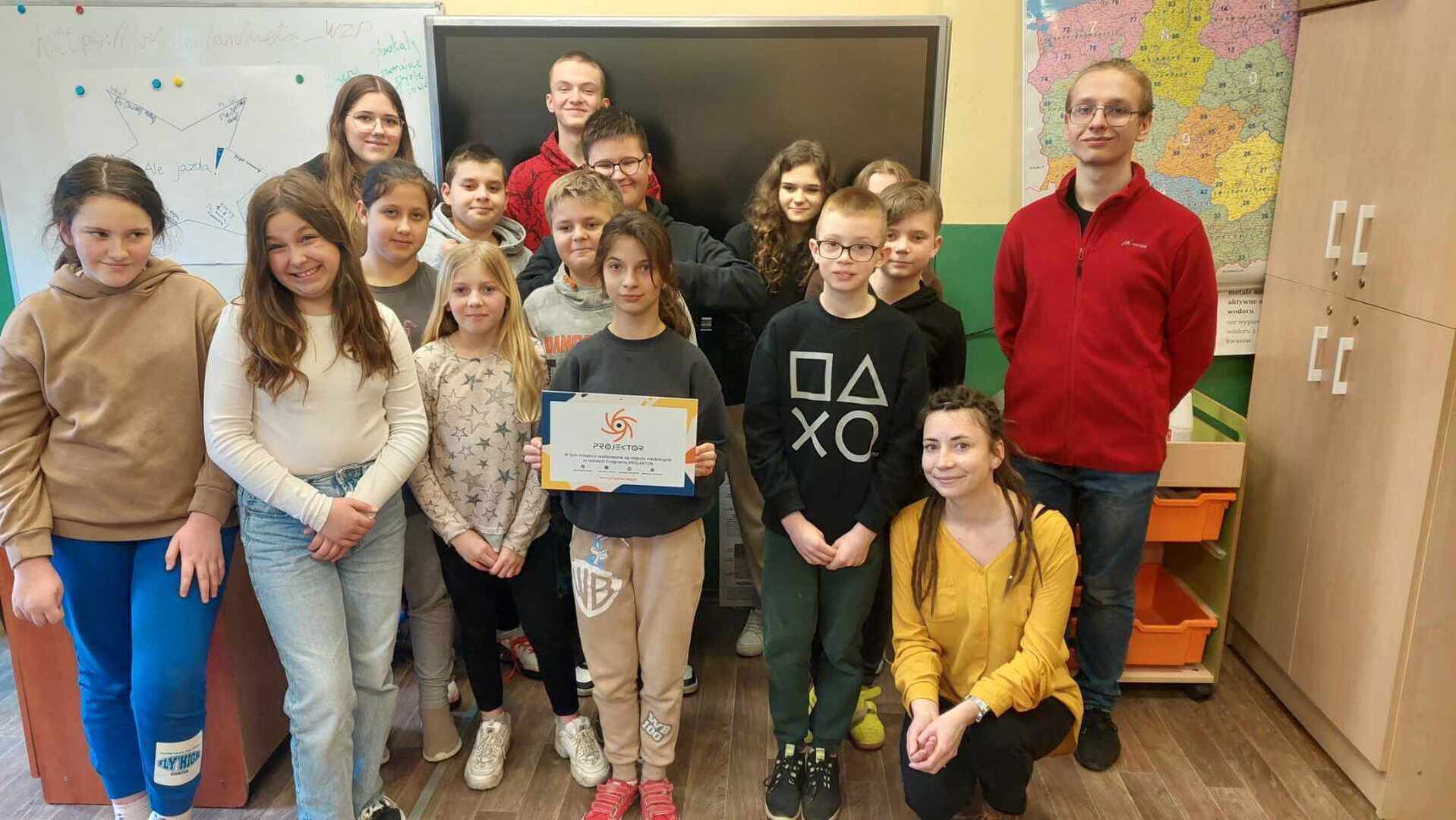 Przez dwa dni - 28.02 oraz 06.03 klasy 4, 5 i 6 wzięły udział w zajęciach realizowanych przez wolontariuszy. Głównym zagadnieniem, na którym skupiliśmy się w trakcie warsztatów, była aktywność obywatelska rozumiana jako udział uczniów w życiu społecznym i kulturalnym swojej lokalnej wspólnoty jaką jest klasa, szkoła, wieś, gmina, etc. Aktywność obywatelską uczniów rozwijamy w trzech wybranych przez nas obszarach takich jak: ochrona planety, relacje społeczne, działanie w Internecie. Głównym zagadnieniem, na którym skupiliśmy się w trakcie drugich zajęć była ochrona planety. Uczniowie wspólnie z wolontariuszami zaproponowali promowanie ekologicznego transportu w naszej szkole i najbliższej okolicy poprzez zrobienie plakatu oraz organizację wycieczki rowerowej w czerwcu. PROJEKTOR to program społeczny, który łączy studentów, otwartych i zaangażowanych nauczycieli, ekspertów w dziedzinie innowacyjnej edukacji, partnerów i darczyńców aby docierać do najmniejszych zakątków Polski z projektami społecznymi dla dzieci. Dzięki wolontariackiemu zaangażowaniu studentek i studentów udział w projektach jest bezpłatny. Program powstał w 2005 r. Jego autorem i fundatorem jest Polsko-Amerykańska Fundacja Wolności. W ciągu 18 lat działalności zaangażowaliśmy w działania społeczne ponad 16 000 studentów, którzy zrealizowali zajęcia dla 454 340 uczniów z całej Polski.