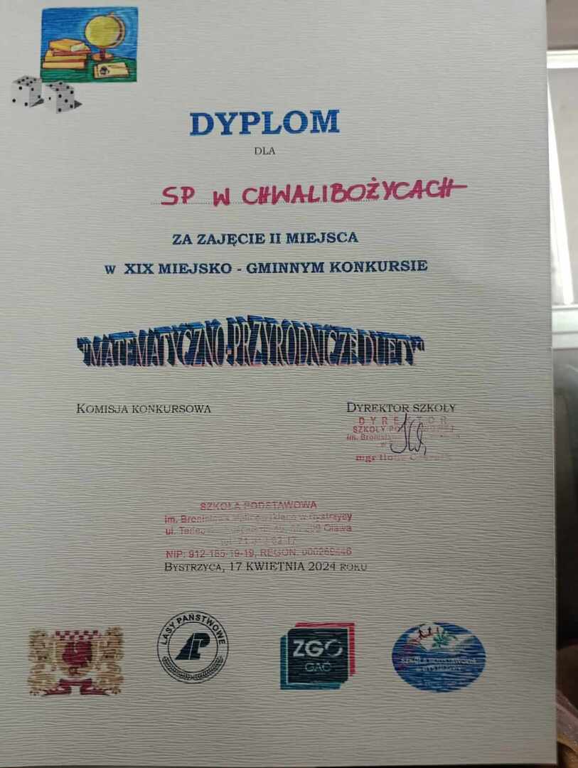 W miejsko-gminnym konkursie ,,Matematyczno-Przyrodnicze duety, uczniowie kl.8 Szymon i Justyna znaleźli sie na podium, na 2 miejscu. Wiedza ogromna, a wynik bardzo cieszy, bo rozgrywki były miejsko-gminne!