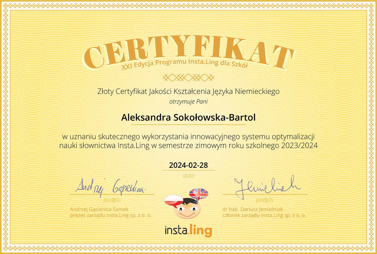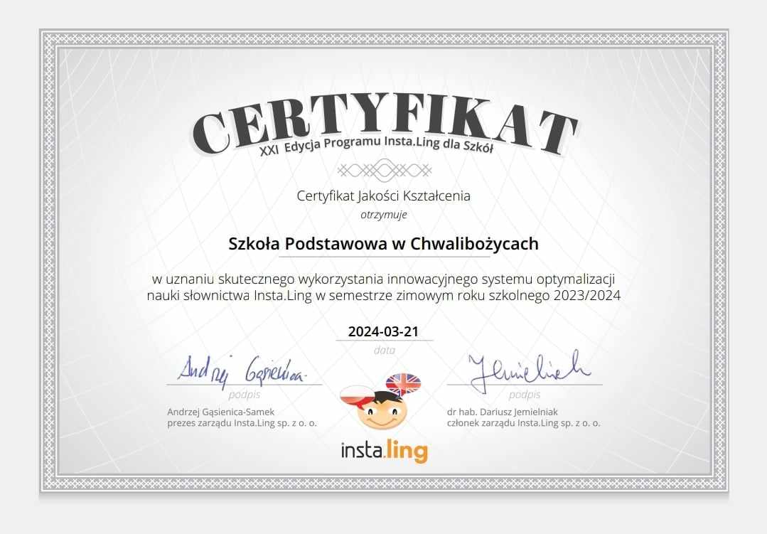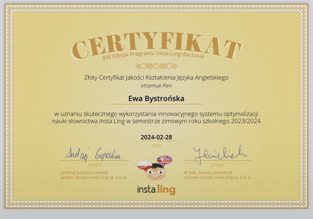 Zakończyliśmy XXI edycję ogólnopolskiego programu do nauki i utrwalania słówek z języka angielskiego i niemieckiego Instaling. Zarówno szkoła, jak i nauczyciele uczestniczący w programie otrzymali Certyfikat Jakości Kształcenia Języka Angielskiego i Niemieckiego. Oczywiście, nadal kontynuujemy naukę i dlatego już przyłączyliśmy się do kolejnej, XXII edycji, czyli semestru letniego.