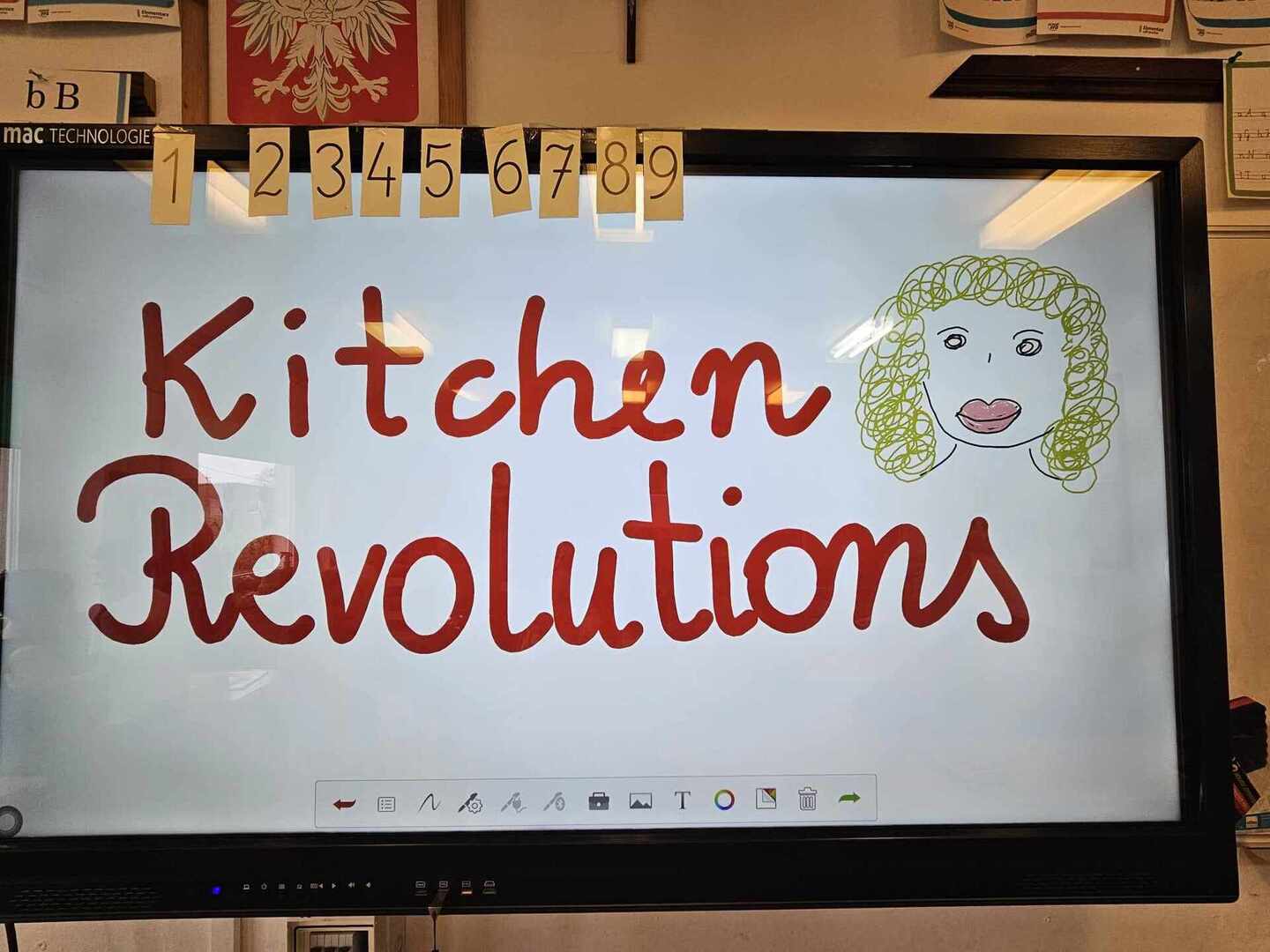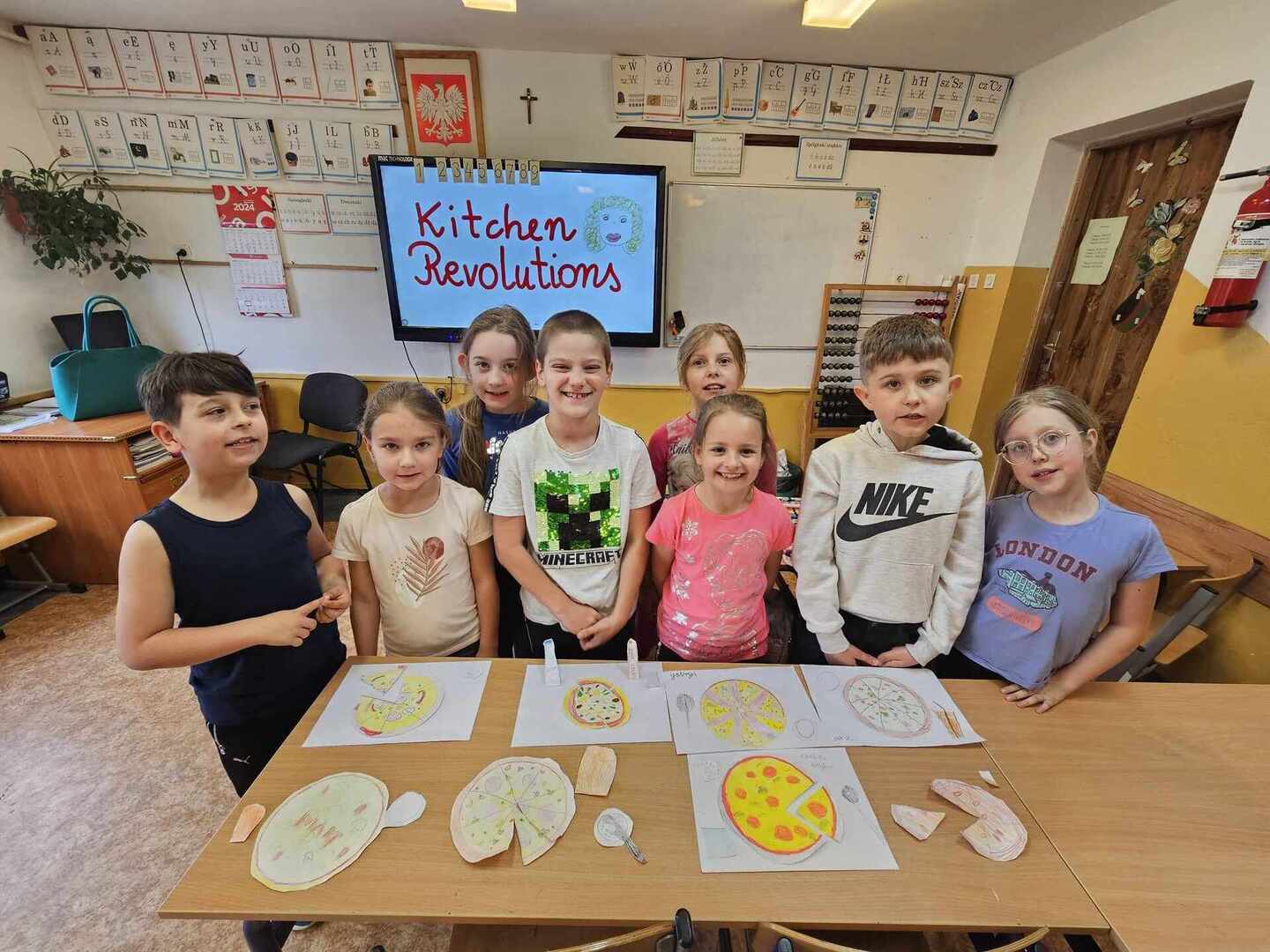 W środę, 17 kwietnia, klasa II na lekcji jezyka angielskiego utrwalała materiał leksykalny poprzez zabawę nawiazujaca do programu telewizyjnego 'Kuchenne Rewolucje'. Uczniowie zagrali role właścicieli pizzerii, a nauczyciel, jako p. Magda Gessler oceniała przygotowane przez nich pizze. Dla urozmaicenia zabawy, każda pizza wymagała udoskonalenia ('dopieczenia', czyli dokładniejszego pokolorowania, 'dodania' jakiegoś skladnika). Nie obyło się bez rzucenia pizzy na podłogę (nawiązanie do rzucania talerzami przez słynną restauratorkę).