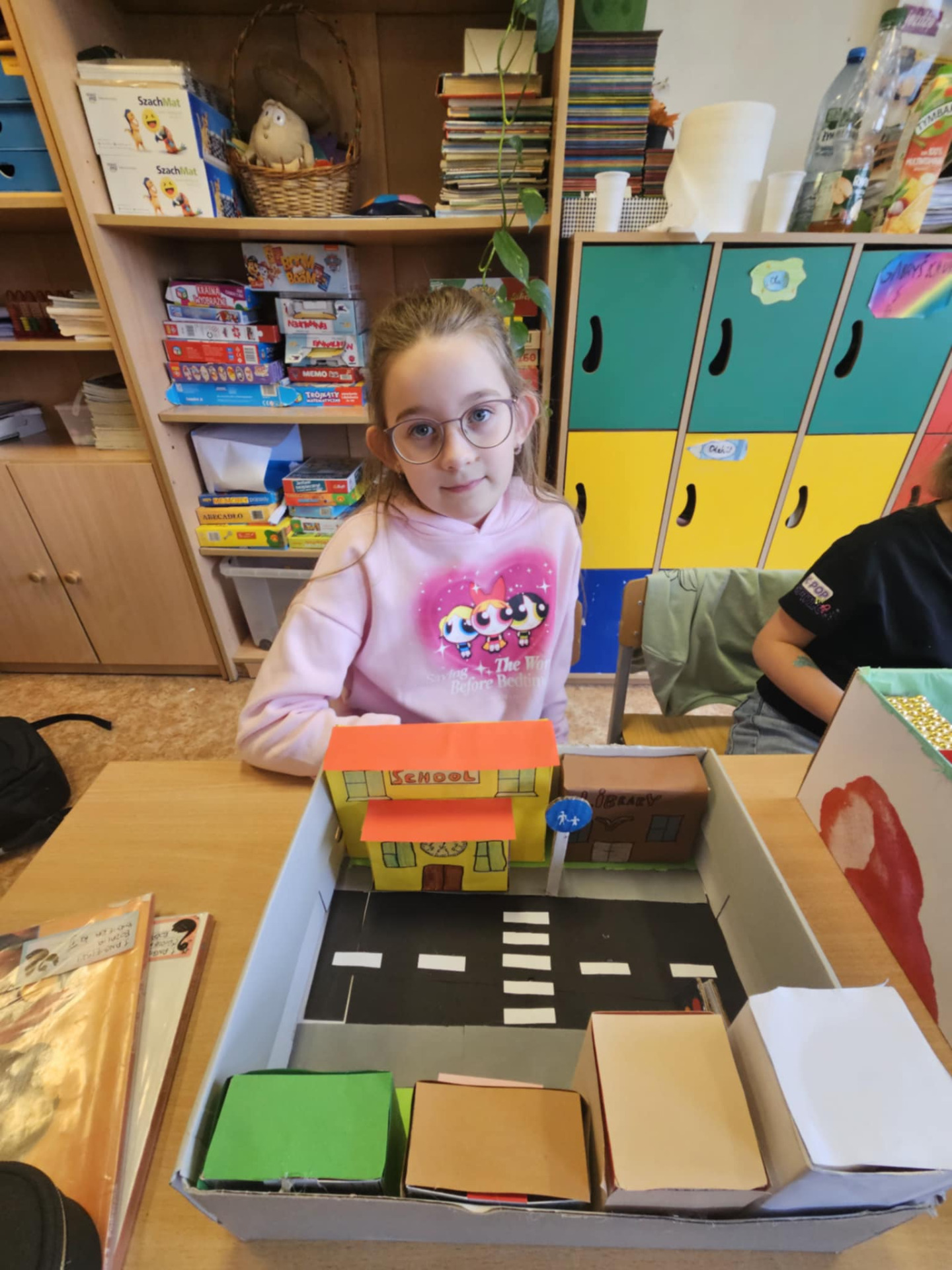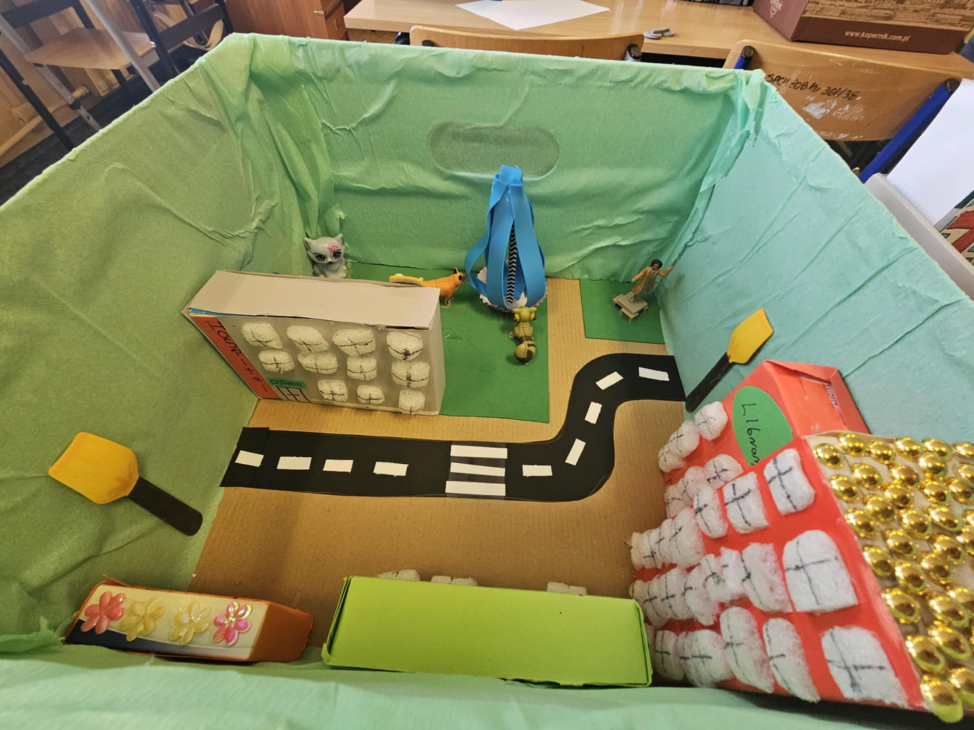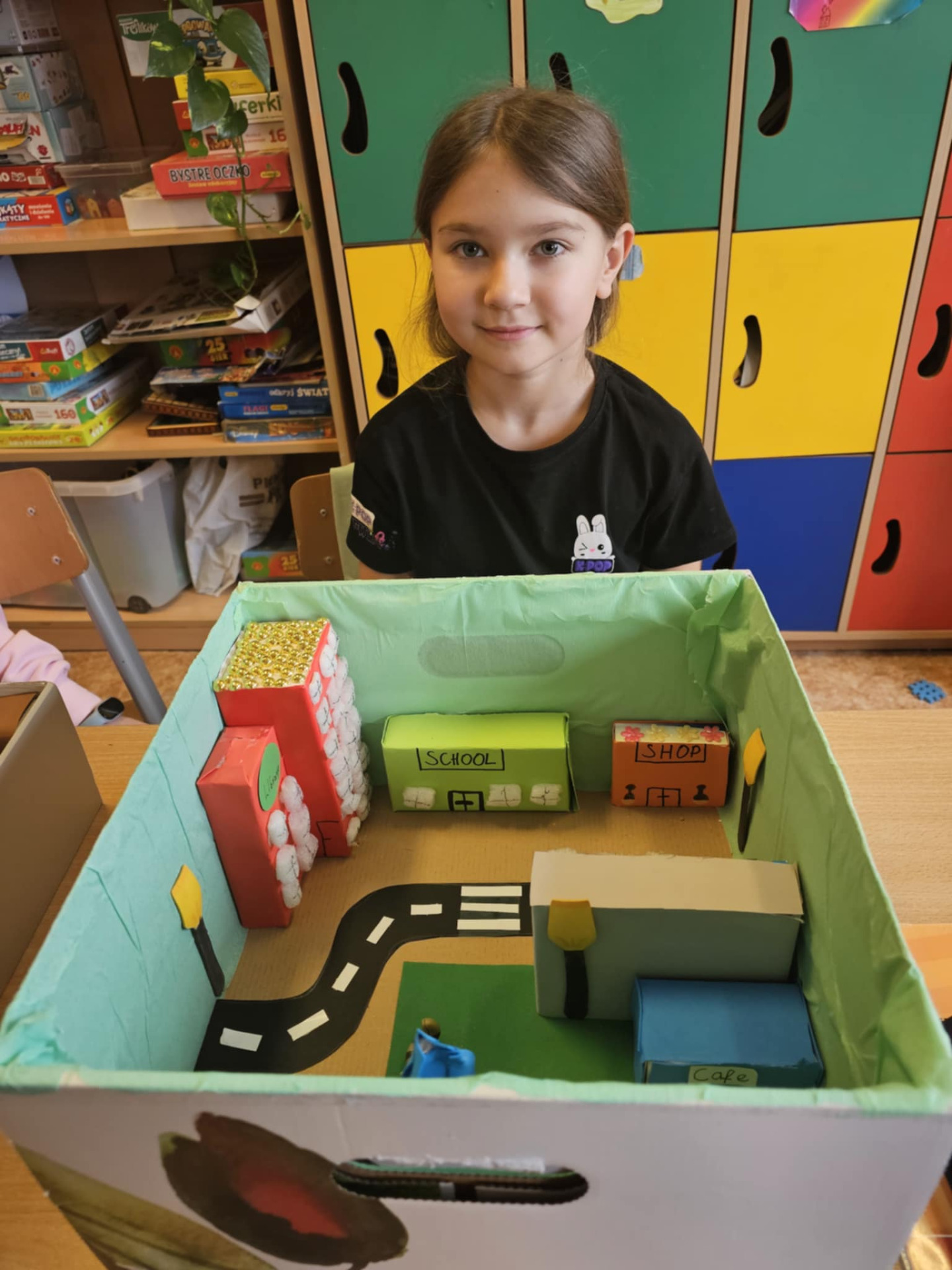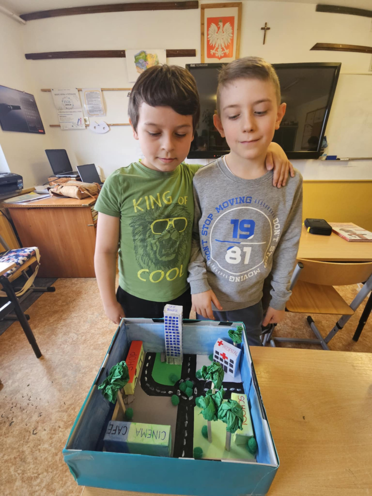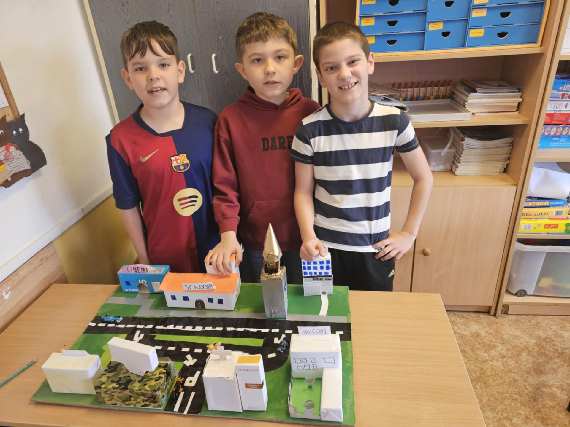 Pomysłowość naszych uczniów jest imponująca. Dzieci z klasy 0 oraz III nietypowo utrwalały poznane słownictwo i zwroty. Zerówka powtarzała wyrażenia związane ze sportem prezentując to, co potrafią robić w ruchu i za to wszyscy otrzymali złote medale. Trzecioklasiści zaś po opanowaniu leksyki dotyczącej miasta, a zwłaszcza budynków, przygotowali ciekawe makiety, które możemy podziwiać tu, na zdjęciach. Brawo uczniowie!