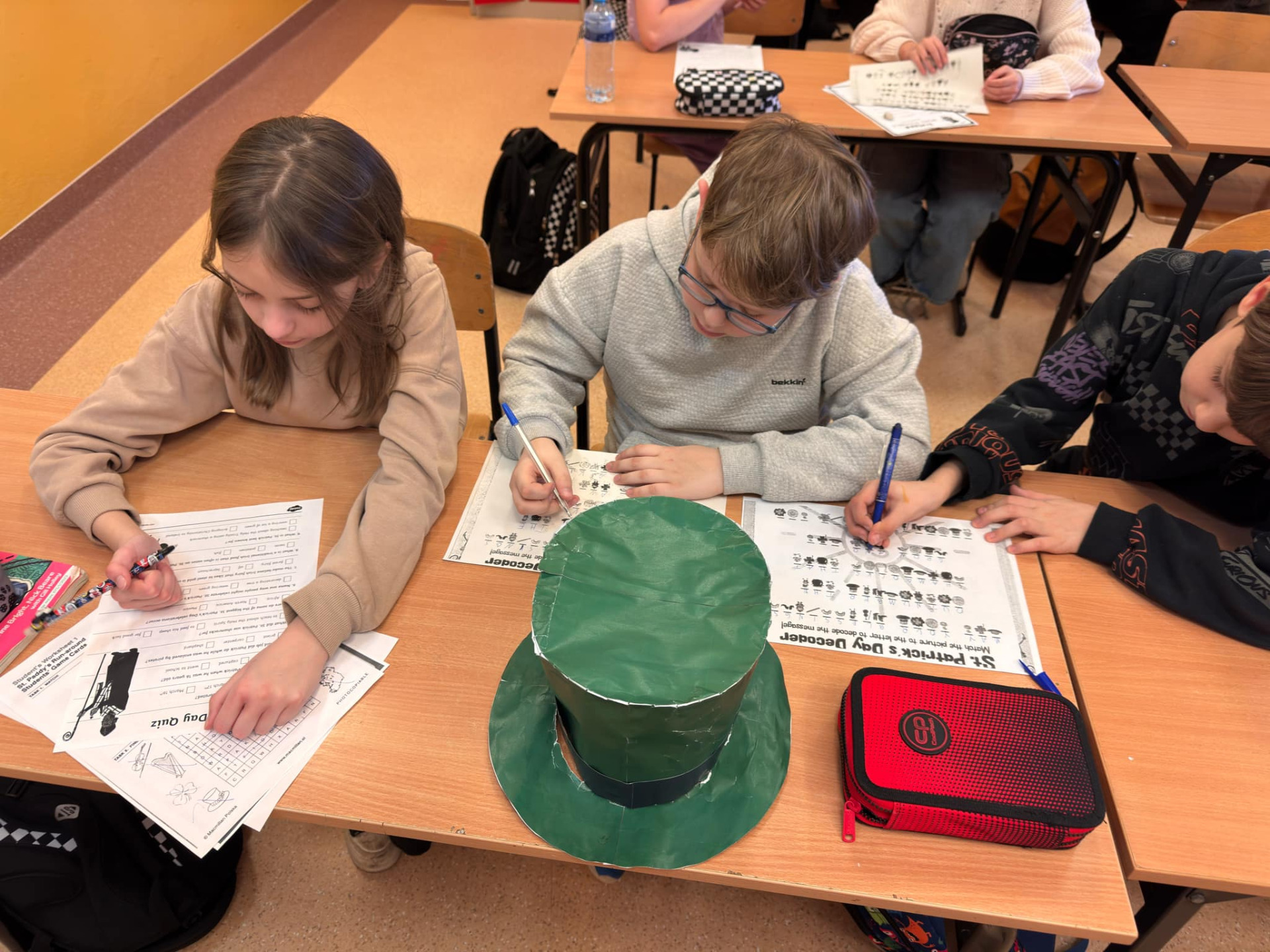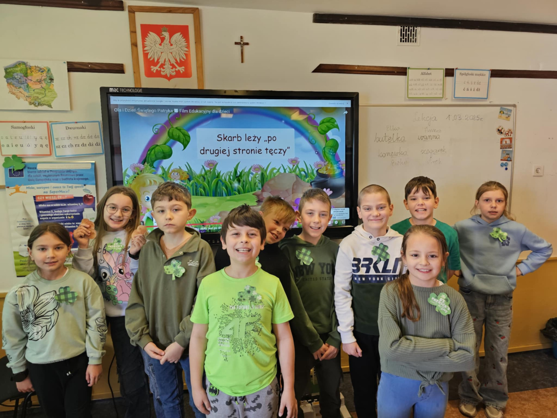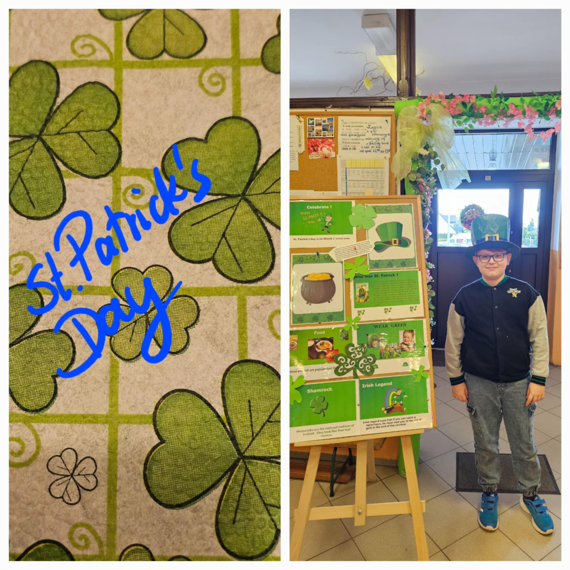 17 marca, z okazji obchodów dnia św. Patryka spora grupa uczniów ubrała sie na zielono. Tego dnia uczniowie rozwiązywali zagadki zwiazane z osobą świętego patrona Irlandii oraz legendą o skarbie znajdującym się na końcu tęczy. Dzieci poprzypinały sobie przygotowane dla nich koniczynki - symbol Irlandii. Niektóre klasy poszukiwały złotych monet ukrytych w przeróżnych zakamarkach przez p. K. Szyszkę, a p. E. Bystrońska przygotowała gazetkę o symbolach i zwyczajach związanych z tym świętem, którą możemy poczytać przy wejściu do szkoły.