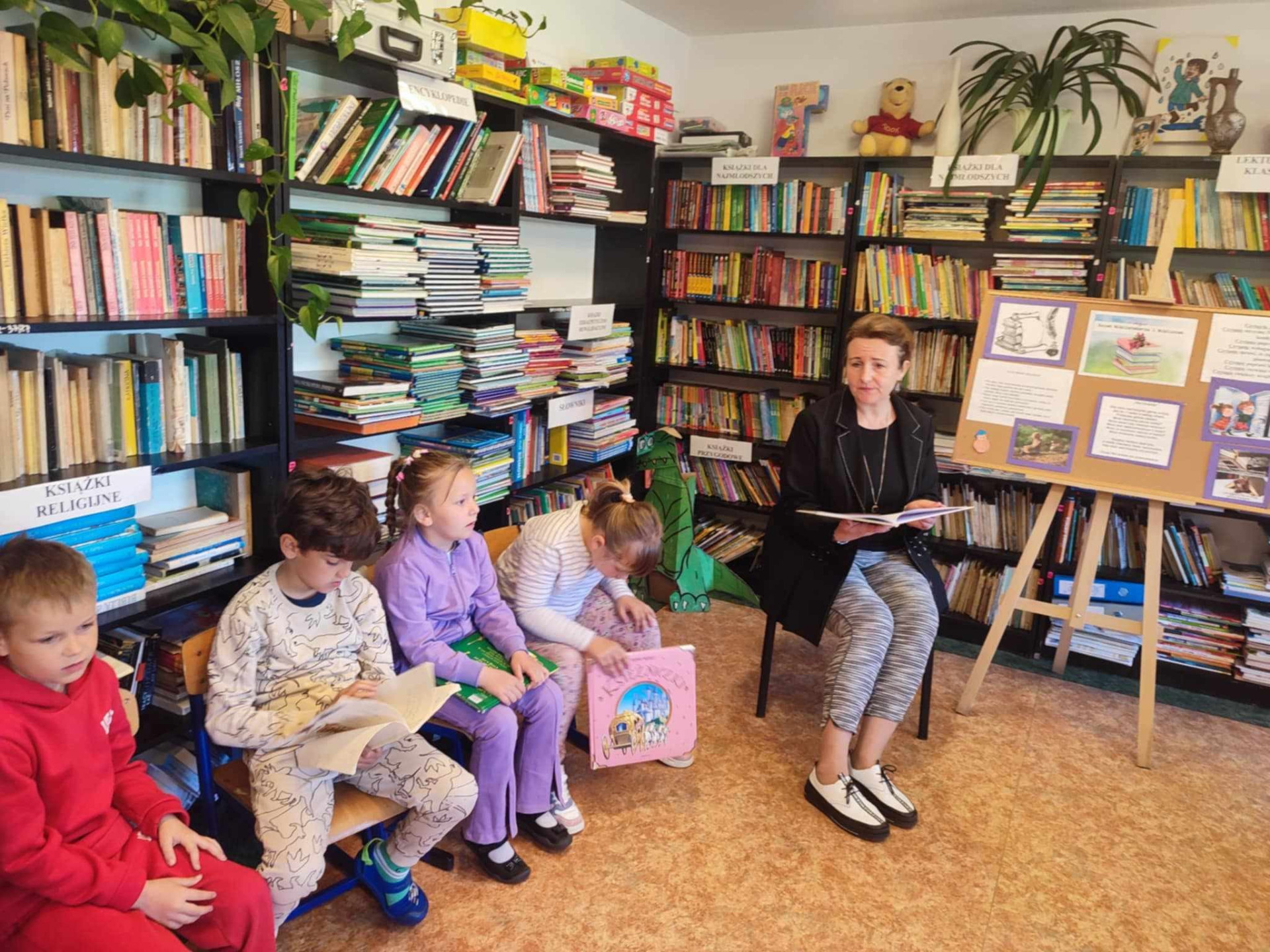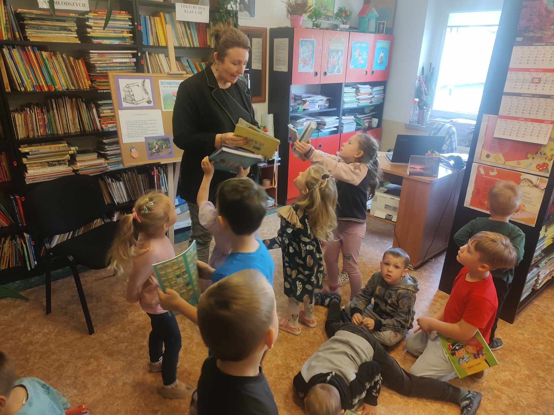 Pani bibliotekarka zapoznała uczniów z podstawowymi zasadami, które obowiązują każdego czytelnika. Dzieci chętnie sięgnęły po nowe książki zakupione dzięki projektowi NRCz.