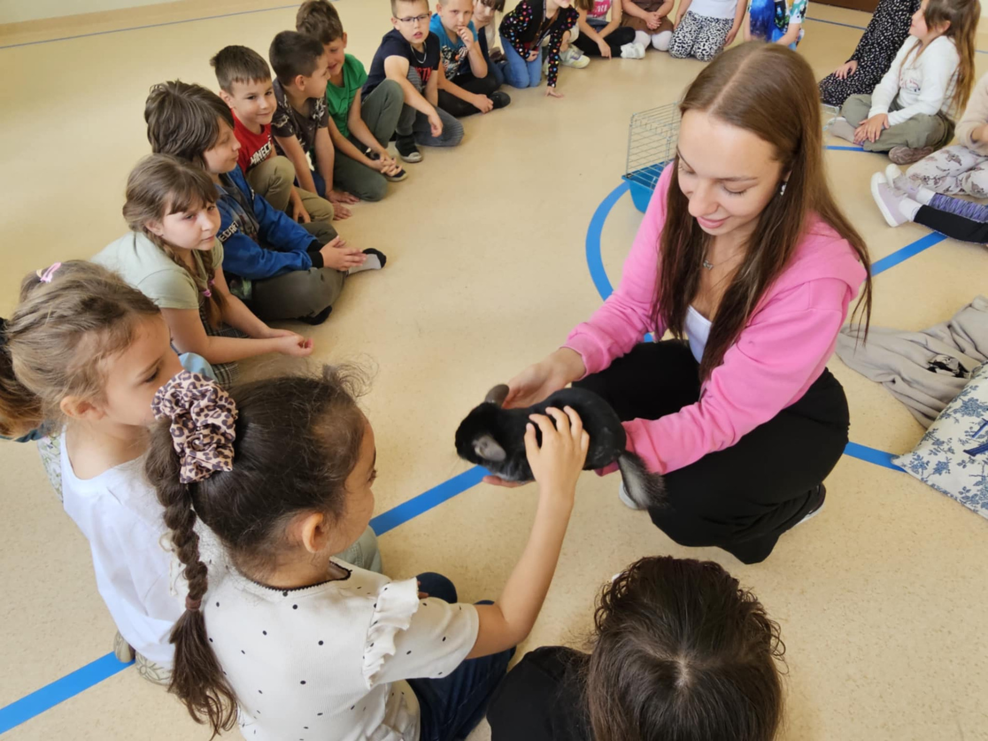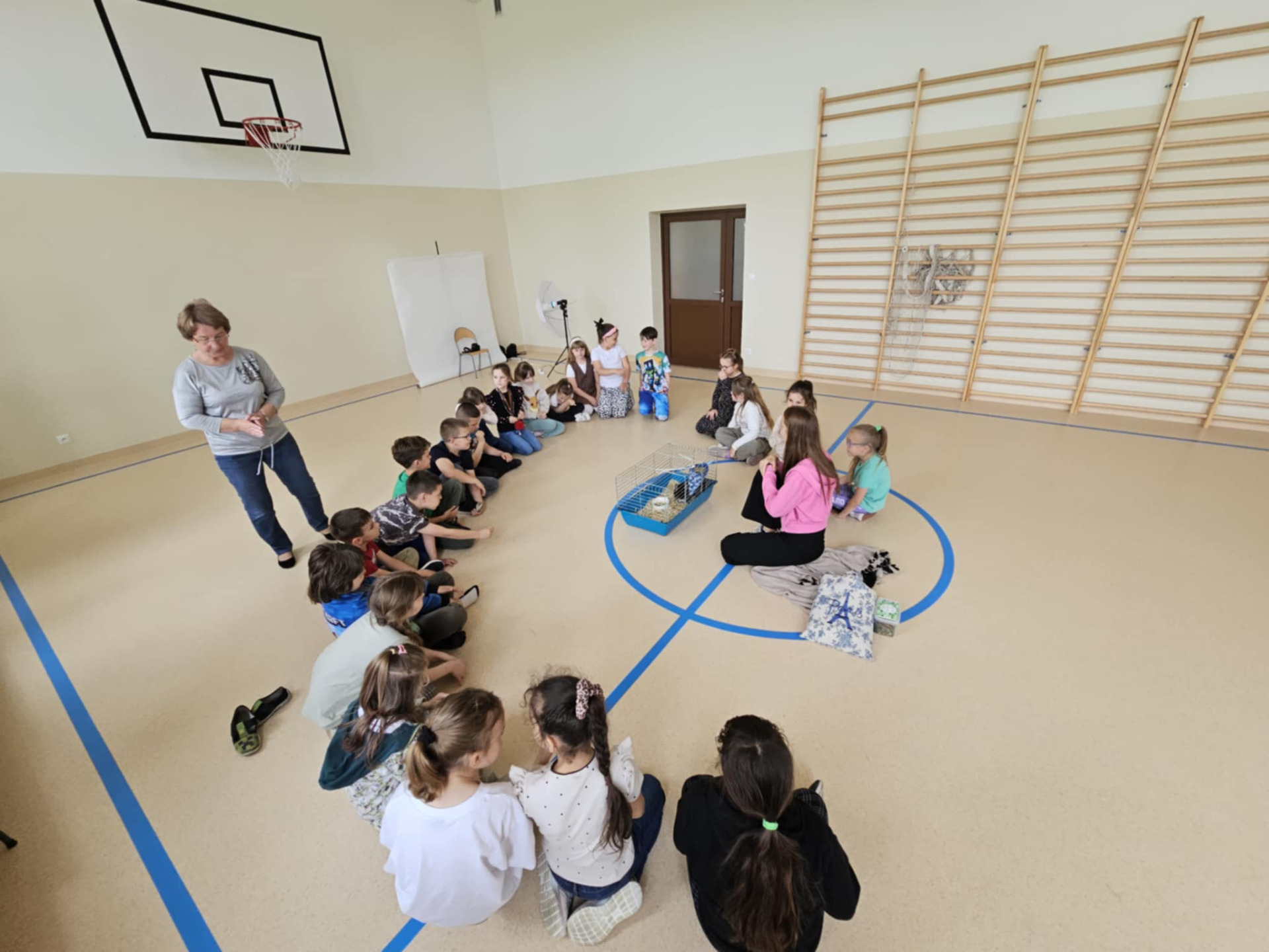 16 maja uczniowie klas 1-3 uczestniczyli w warsztatach przyrodniczych, które poprowadziła pani Wiktoria, właścicielka dwóch sympatycznych szynszyli: Robina i Batmana. Prowadząca zajęcia opowiadała dzieciom o życiu swoich pupili, zadawała przeróżne pytania dotyczące tych zwierząt, dzieci chętnie odpowiadały na kierowane do nich pytania. Każdy uczeń miał mozliwość pogłaskania zwierzaka.