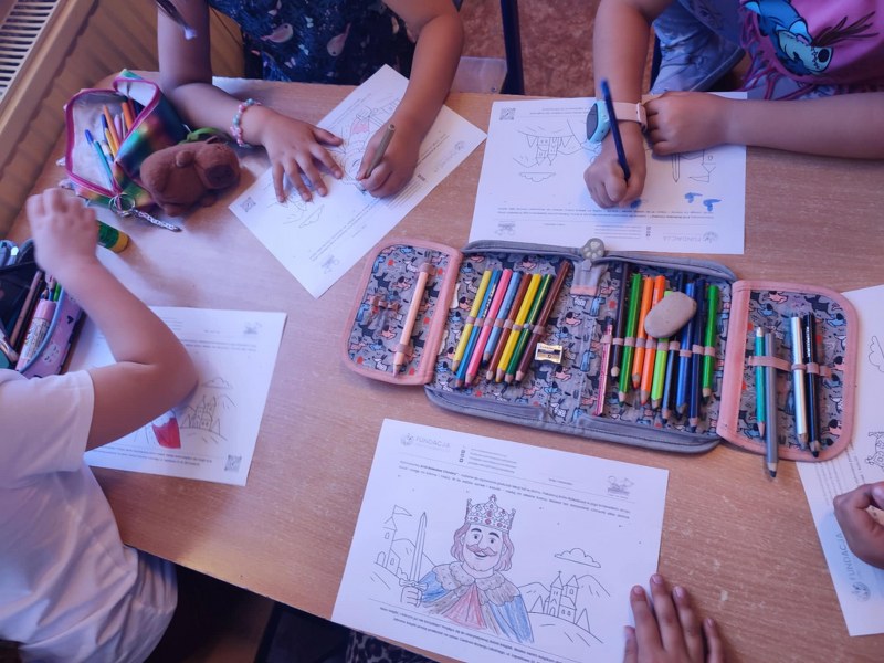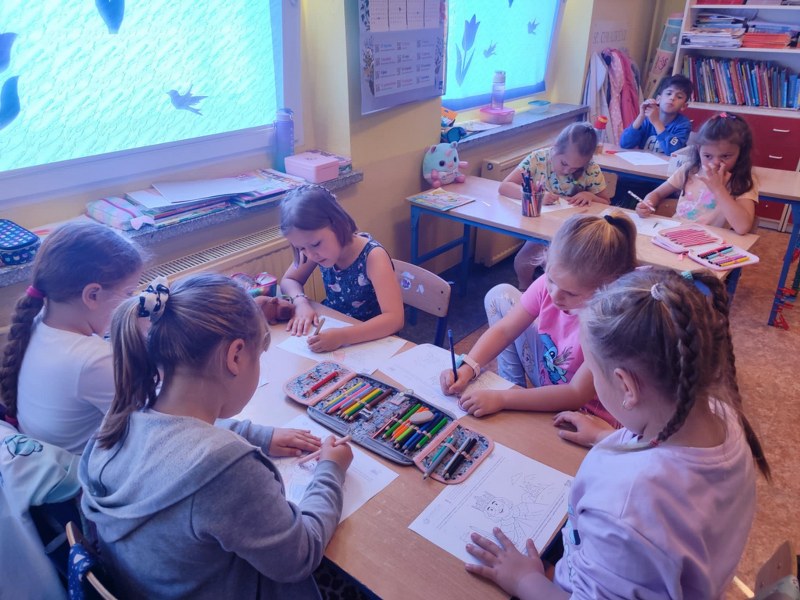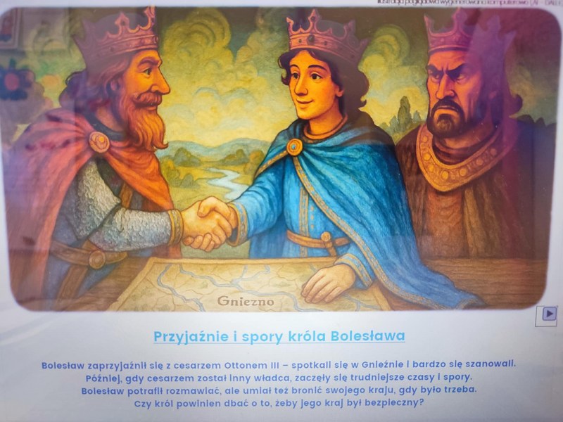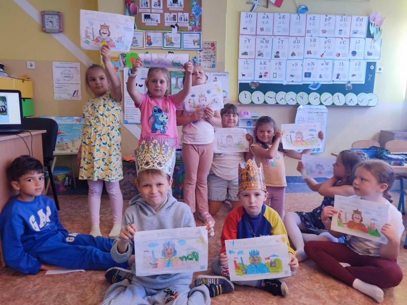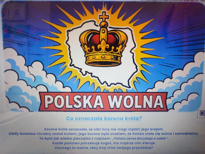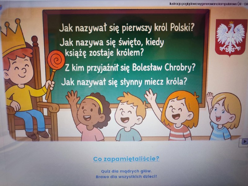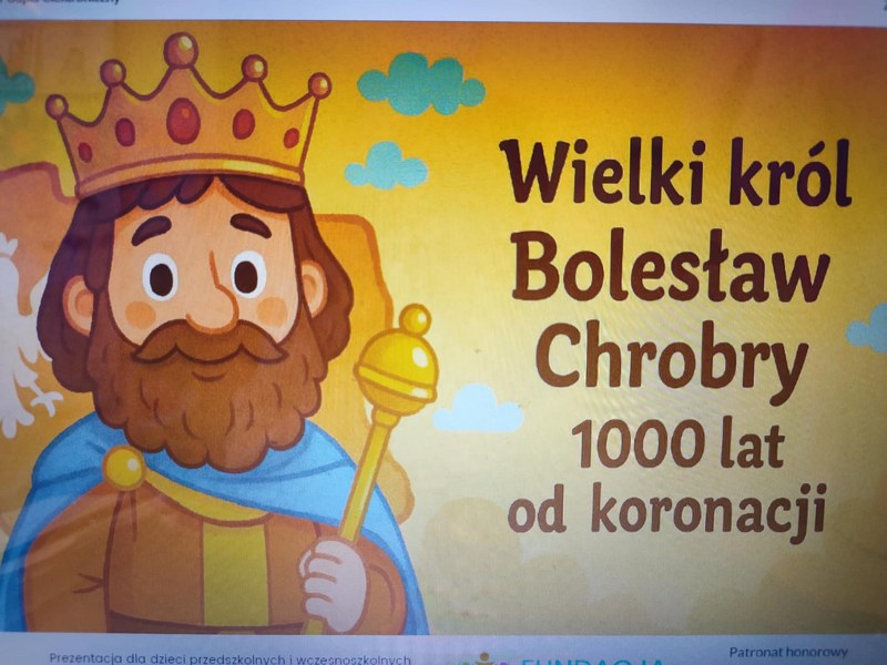 Dzieci z klasy 0 korzystając z materiałów edukacyjnych fundacji ,,Dzieci uczą rodziców" poznały postać pierwszego króla Polski Bolesława Chrobrego, który został koronowany 1000 lat temu. Oglądając prezentację multimedialną dowiedziały się wiele ciekawostek o życiu króla Bolesława, rozwiązywały quiz odpowiadając bardzo dobrze na wszystkie pytania i przygotowały wystawę prac kolorując obrazek ,,Król Bolesław i jego korona".
