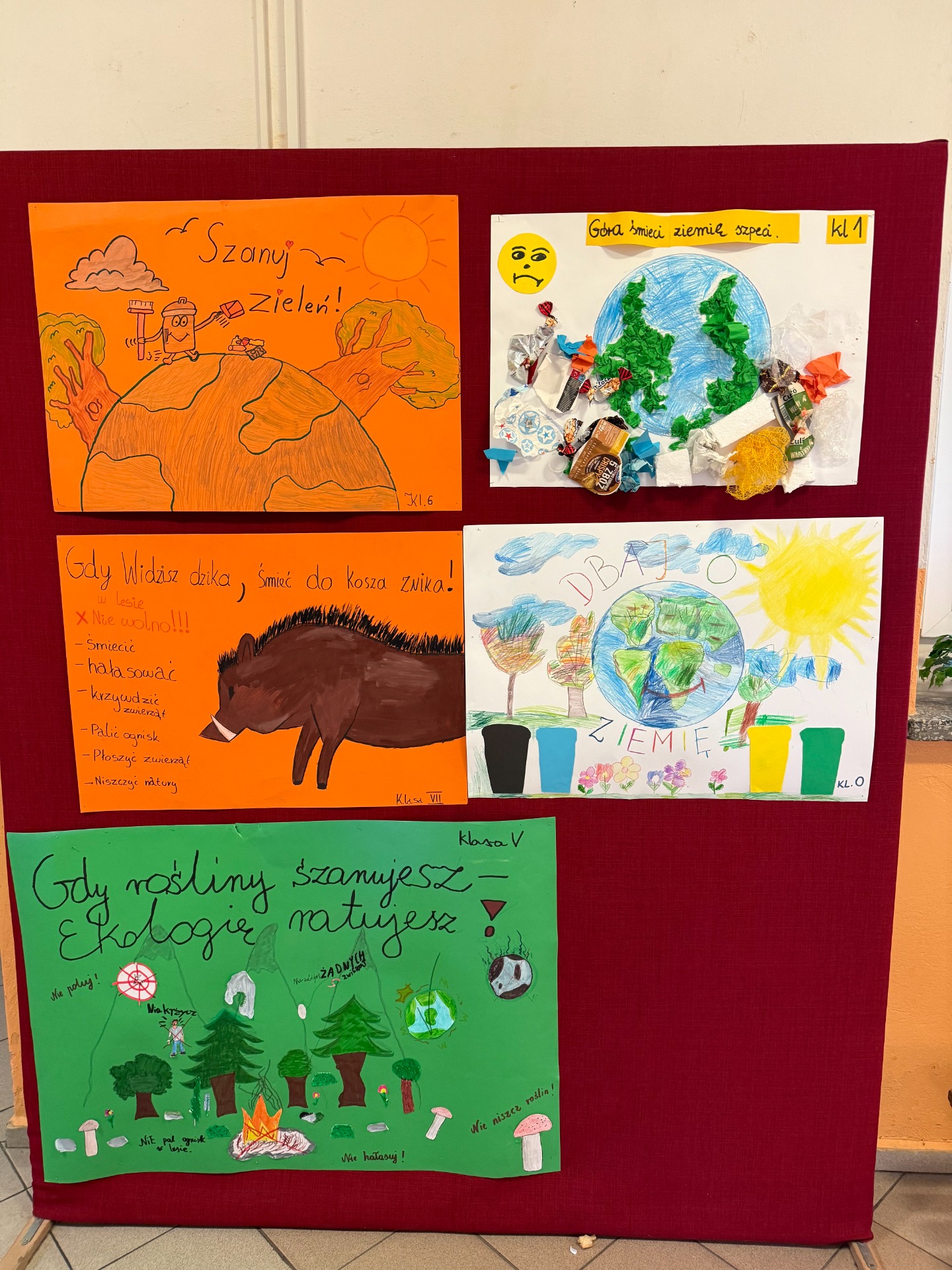 Prace dzieci zostały wyeksponowane na gazetkach szkolnych.