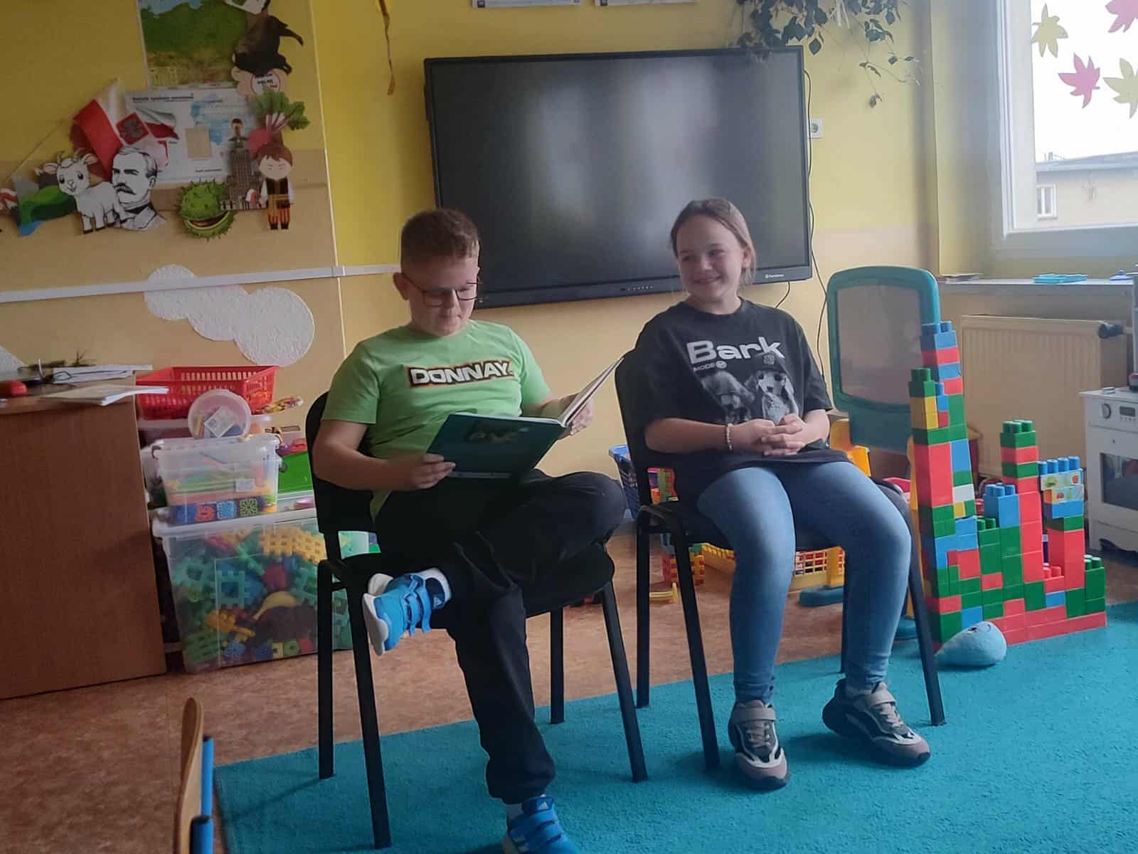 17 października w ramach comiesięcznej akcji " Starsi czytają młodszym", uczniowie klasy V- Julia Zajadlak i Jakub Gajderowicz zawitali do swoich młodszych kolegów i koleżanek z oddziału przedszkolnego i przeczytali " Opowieści o tym, co daje moc". Teksty zapraszają czytelników do niezwykłej, a jednocześnie tak bliskiej każdemu krainy wartości, po których oprowadzają nas bohaterowie książki: Julka i Miłosz. W dzisiejszym dniu nasi mlodsi uczniowie wysłuchali utworów nawiązujących do tego, aby być dobrym, kulturalnym, uprzejmym, a także pokornym. Książka jest dostępna w naszej bibliotece dzięki programowi Narodowego Rozwoju Czytelnictwa, który ma na celu propagowanie czytelnictwa wśród dzieci i młodzieży.