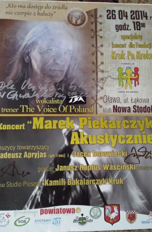 Marek Piekarczyk wystapił w Oławie z koncertem charytatywnym "Akustycznie...". Udało mi się zdobyć autograf i pozdrowienia dla naszych uczniów.